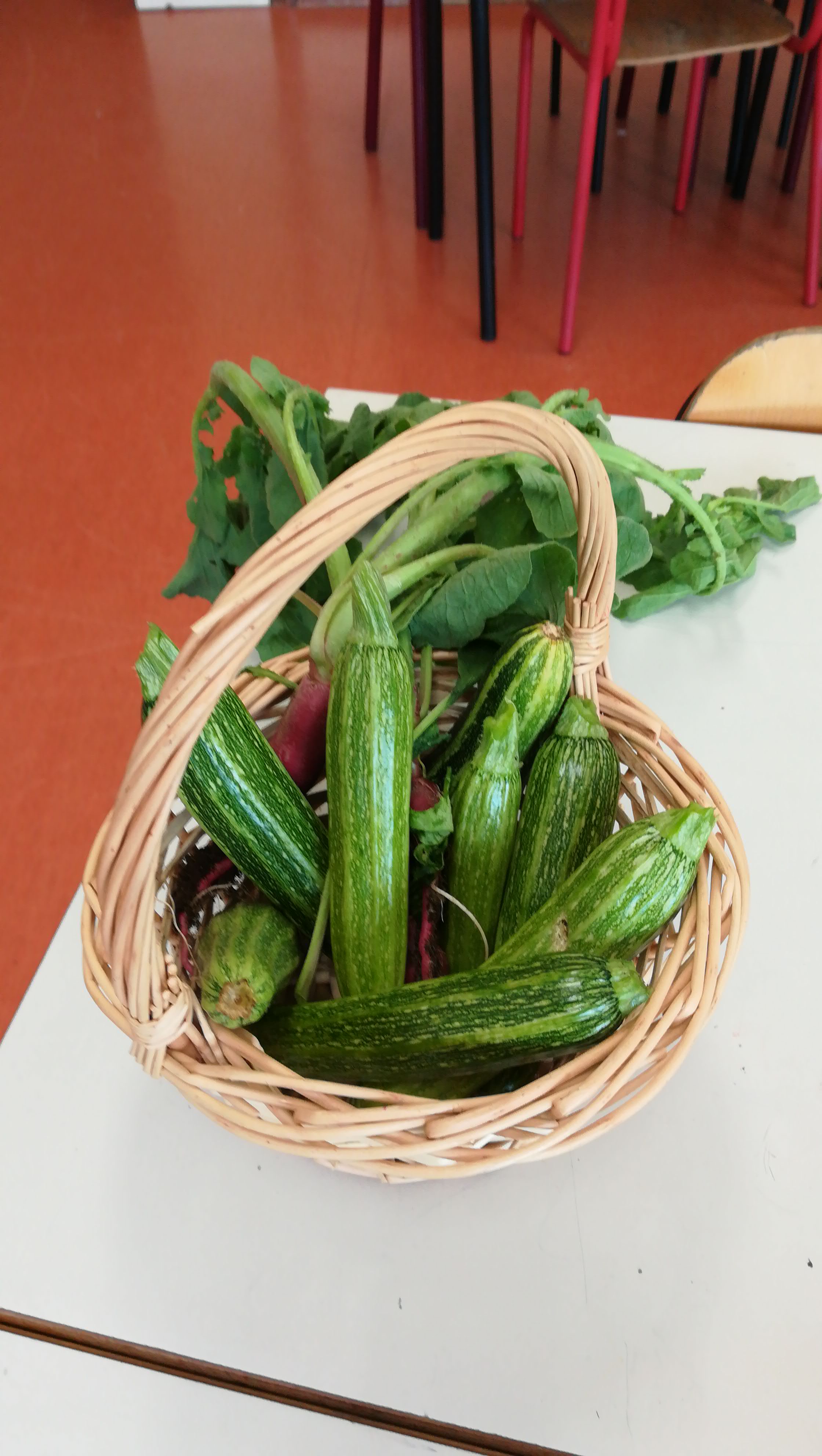 Queste sono le zucchine alcuni ravanelli( quelli seminati fitti!) del nostro orto a scuola.