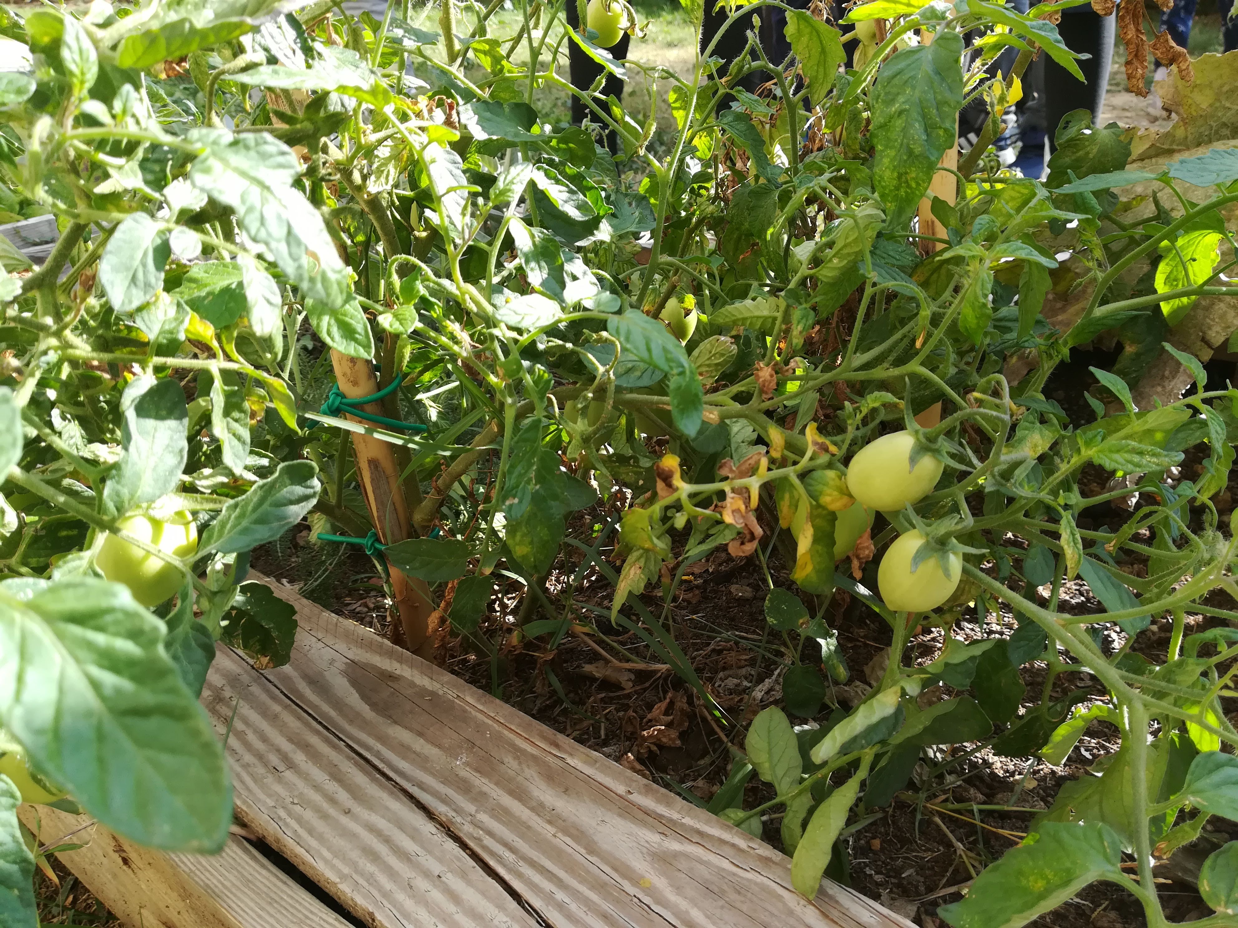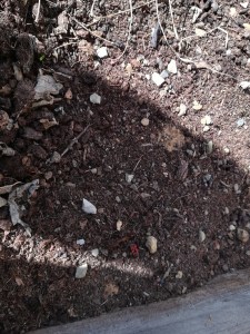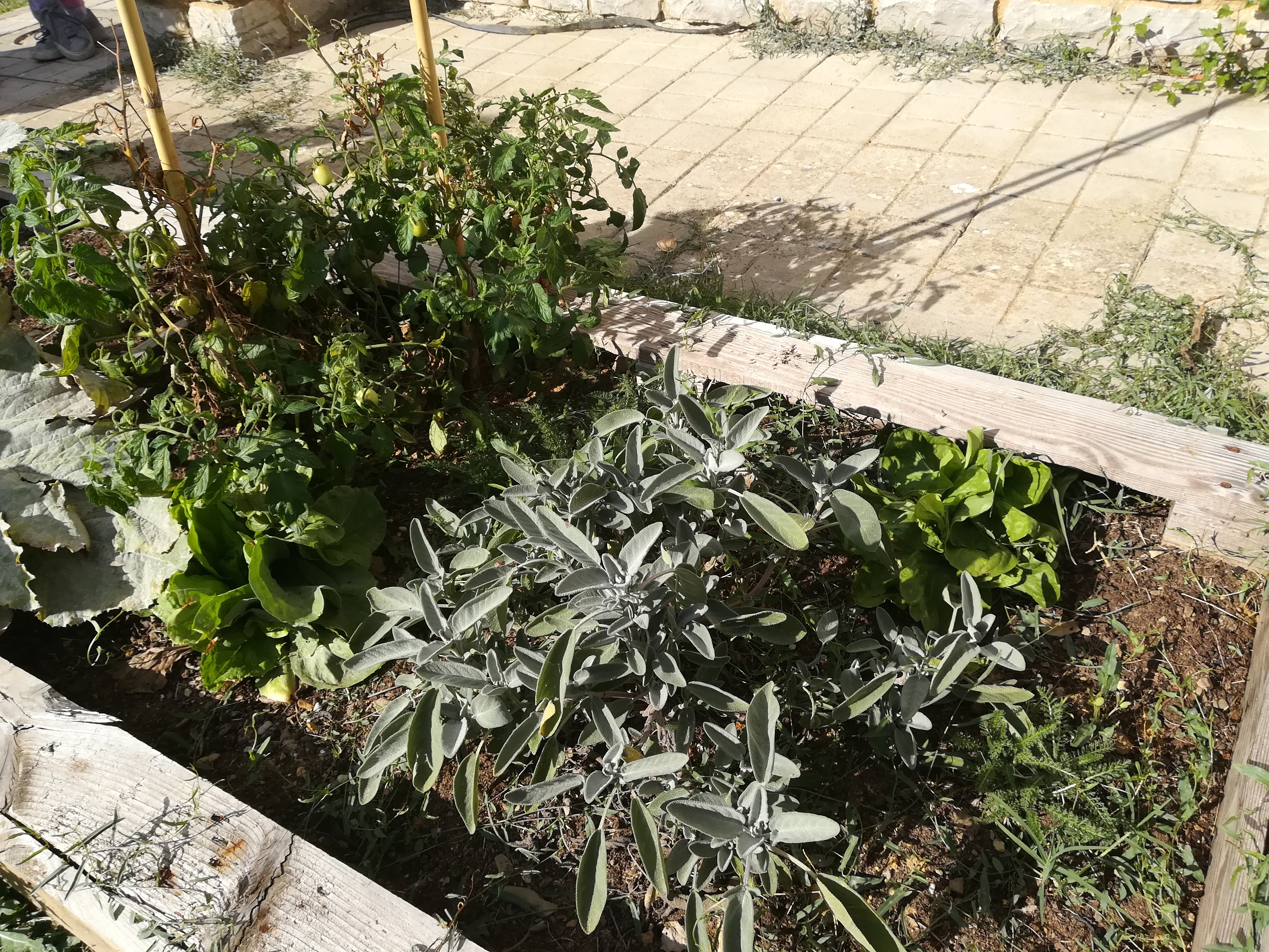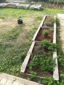 Appena siamo arrivati ci siamo messi a lavoro. Qualcuno strappava le erbacce, Boss-01 e Cleo* facevano le fotografie, alcuni hanno raccolto le zucche e l’insalata, Bianca toglieva le foglie sciupate dalla salvia e dai pomodori ( a proposito la pianta di pomodoro sta ancora bene è bella e rigogliosa, dà ancora i suoi frutti ). Un gruppetto ha tolto le erbacce che stavano soffocando la menta e il timo. Luna e Furioso ci hanno chiamato per dirci che, da sotto la gramigna, un piccolo scarabeo luccicante si arrampicava sulle assi di legno dell’orto. Alcuni animaletti rossi hanno fatto la loro casetta in un angolo dell’orto, coperta dalle foglie della zucca; correvano in qua e là. Le erbacce raccolte le abbiamo messe intorno alle assi per seccare: serviranno per la pacciamatura.
