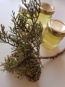 Rametti di cipresso, ciotola, panno (filtro), fornello, barattoli, pentola,etichette, olio inodore.