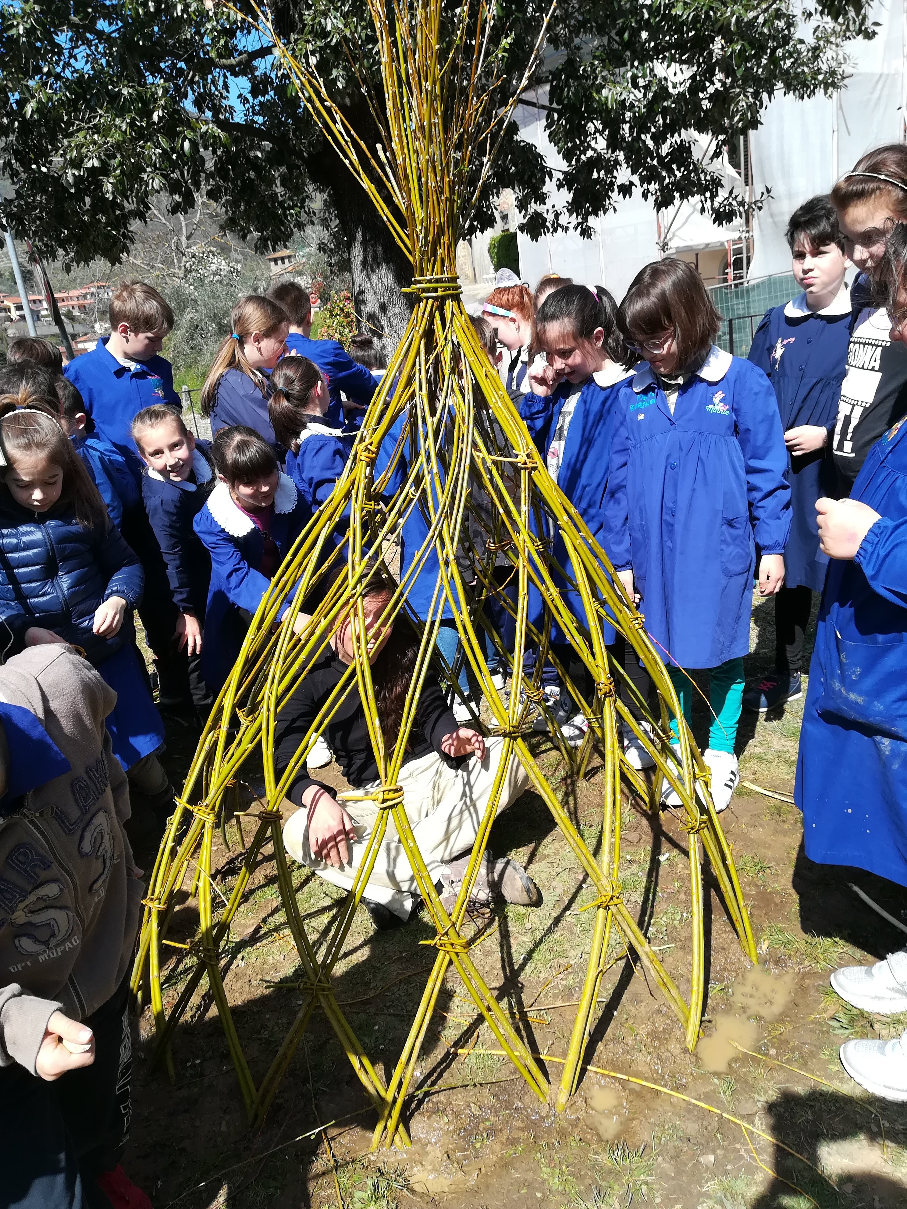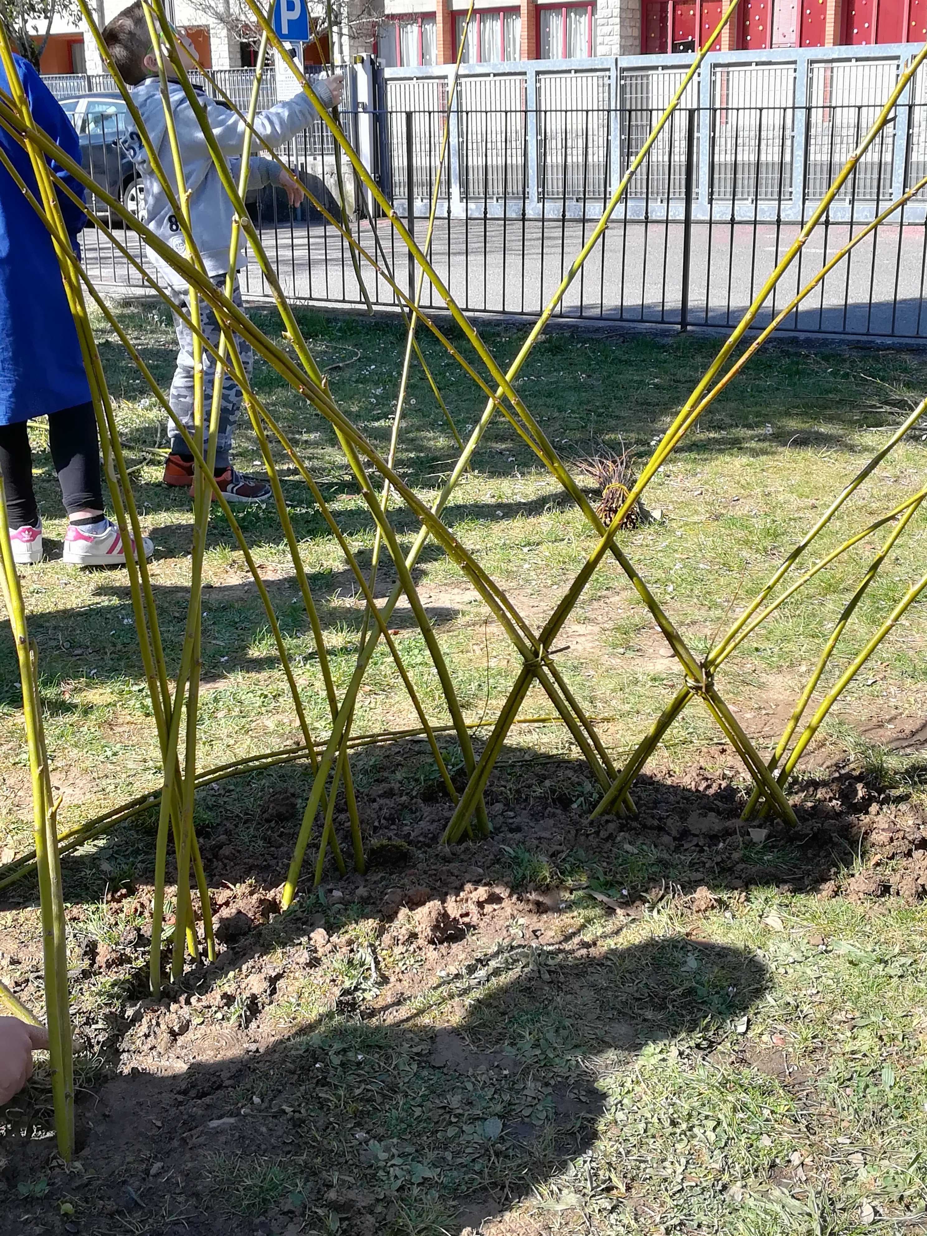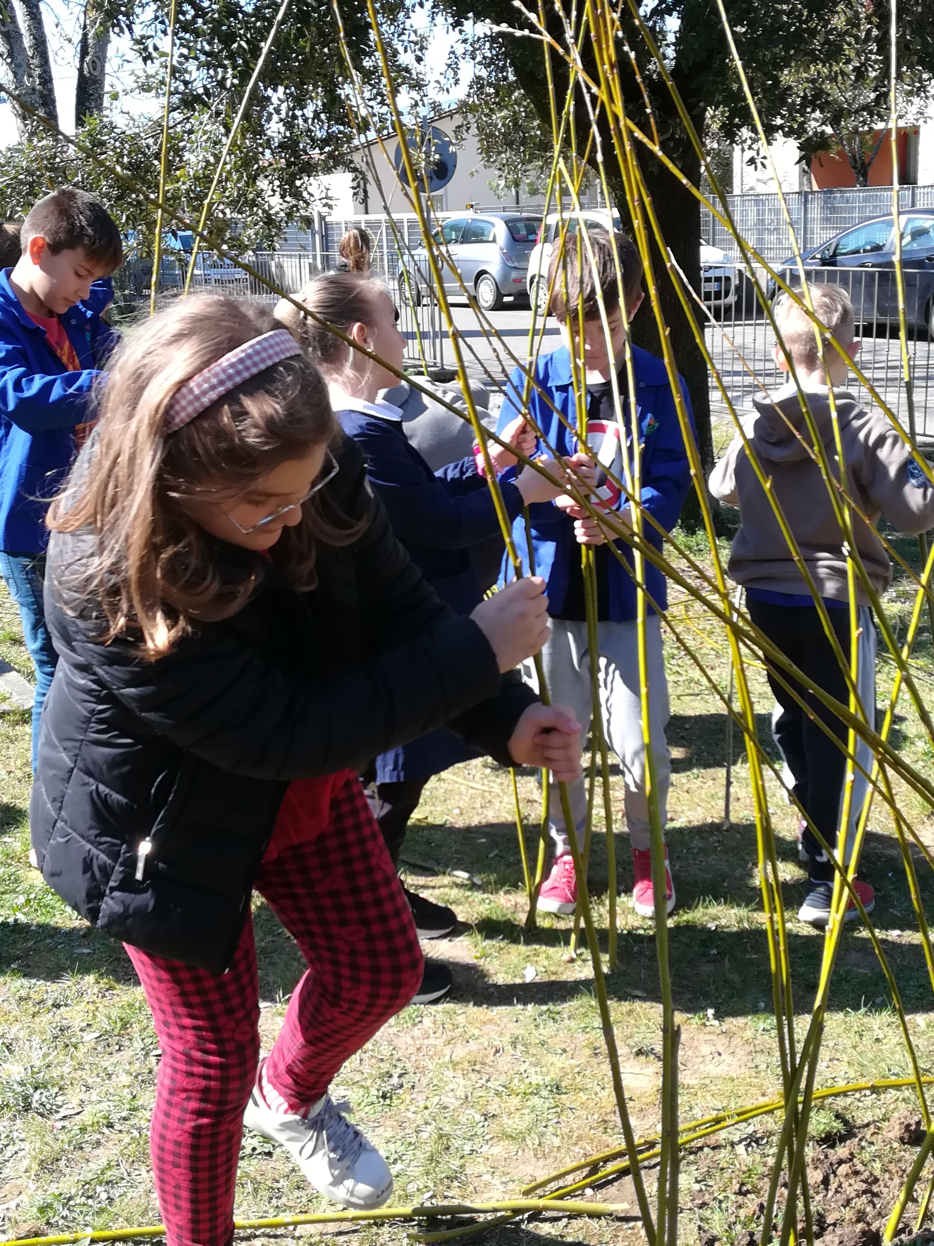 Venerdì 29 marzo abbiamo costruito una capanna vivente nei giardini pubblici, davanti alla nostra scuola. Con noi c’era la nostra esperta Dorothée che ci ha insegnato passo per passo come dovevamo procedere. Abbiamo lavorato in piccoli gruppi. Per prima cosa abbiamo scavato un cerchio nel terreno, avendo cura di togliere i sassi che via via trovavamo. Abbiamo annaffiato bene la circonferenza e poi l’abbiamo ricoperta con la terra. Di seguito abbiamo separato i rami di salcio: li abbiamo classificati secondo quattro lunghezze, dal più grande al più piccolo. Abbiamo tagliato la base dai rami in senso obliquo, per poterli piantare con maggiore facilità e per far crescere meglio le radici. Dopo abbiamo iniziato a piantare e intrecciare i rami nella forma che avevamo preparato. Intrecciare i rami è stato piuttosto difficile; occorreva concentrazione e abilità. Ad ogni incrocio bisognava fare un nodo (per legare si usa un ramo piccolo). Quando abbiamo finito l’intreccio, abbiamo legato insieme tutti i rami per chiudere la parte superiore. Naturalmente abbiamo lasciato lo spazio per entrare. Abbiamo nuovamente annaffiato, perché presto nasceranno le radici e le foglie. Siccome la capanna ha bisogno di molta umidità faremo la pacciamatura e l’annaffieremo periodicamente. Ci siamo divertiti e non vediamo l’ora di giocare tra le foglie della capanna vivente.