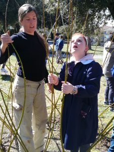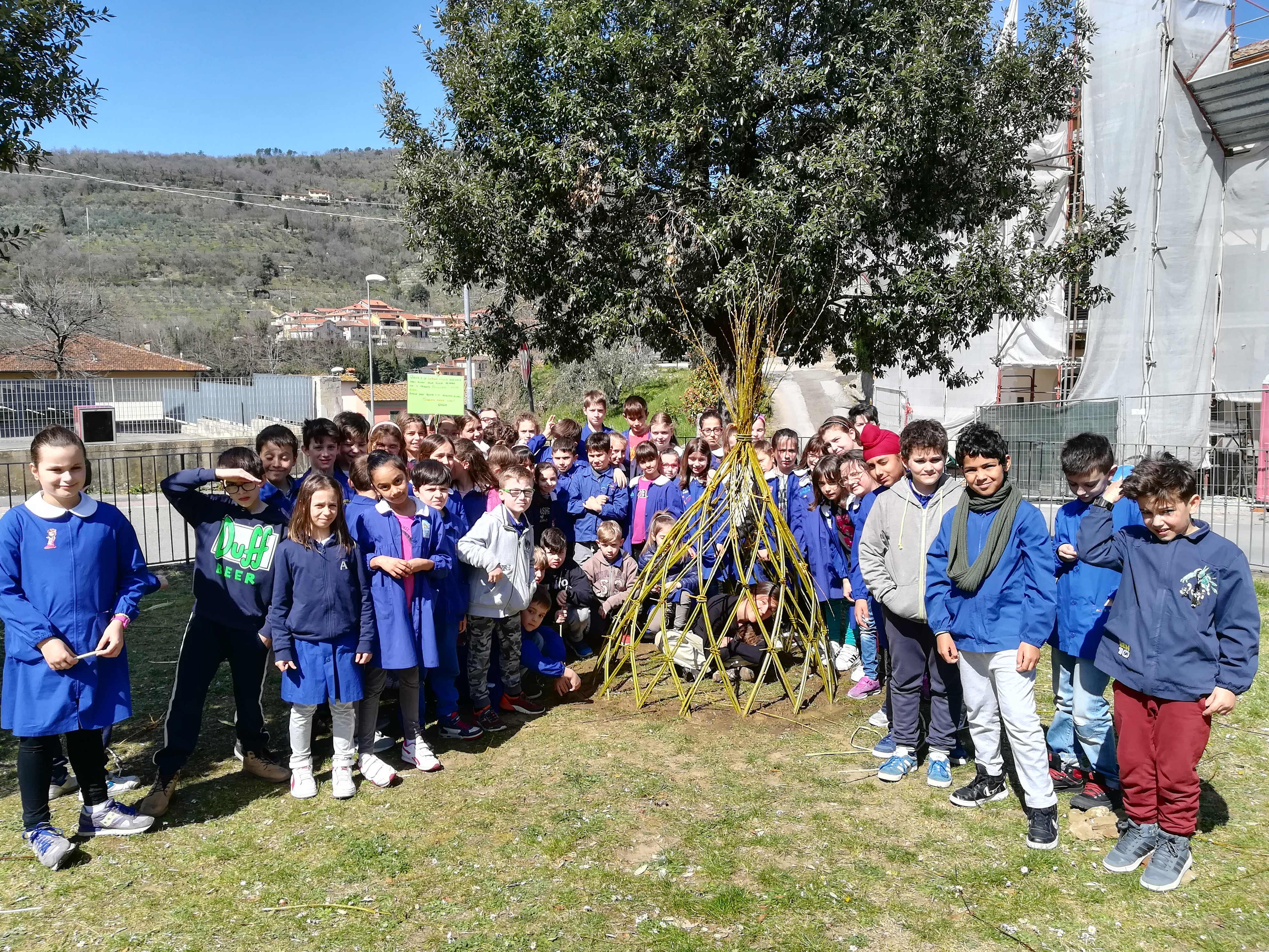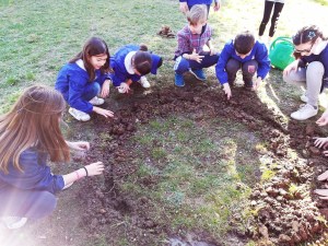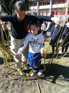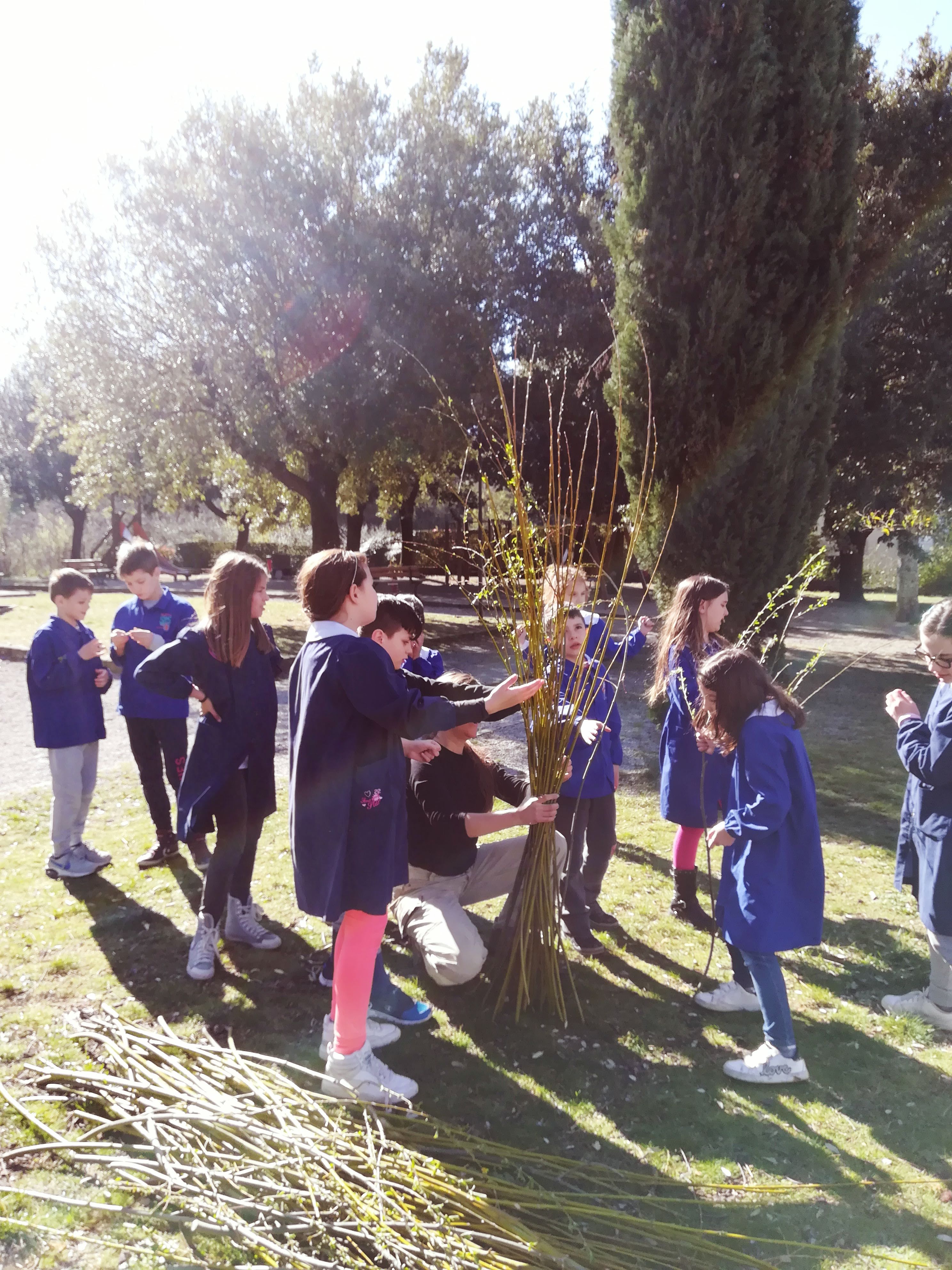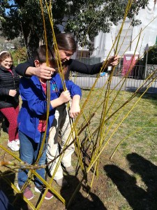 Venerdì 29 marzo abbiamo costruito una capanna vivente nei giardini pubblici, davanti alla nostra scuola. Con noi c’era la nostra esperta Dorothée che ci ha insegnato passo per passo come dovevamo procedere. Abbiamo lavorato in piccoli gruppi. Per prima cosa abbiamo scavato un cerchio nel terreno, avendo cura di togliere i sassi che via via trovavamo. Abbiamo annaffiato bene la circonferenza e poi l’abbiamo ricoperta con la terra. Di seguito abbiamo separato i rami di salcio: li abbiamo classificati secondo quattro lunghezze, dal più grande al più piccolo. Abbiamo tagliato la base dai rami in senso obliquo, per poterli piantare con maggiore facilità e per far crescere meglio le radici. Dopo abbiamo iniziato a piantare e intrecciare i rami nella forma che avevamo preparato. Intrecciare i rami è stato piuttosto difficile; occorreva concentrazione e abilità. Ad ogni incrocio bisognava fare un nodo (per legare si usa un ramo piccolo). Quando abbiamo finito l’intreccio, abbiamo legato insieme tutti i rami per chiudere la parte superiore. Naturalmente abbiamo lasciato lo spazio per entrare. Abbiamo nuovamente annaffiato, perché presto nasceranno le radici e le foglie. Siccome la capanna ha bisogno di molta umidità faremo la pacciamatura e l’annaffieremo periodicamente. Ci siamo divertiti e non vediamo l’ora di giocare tra le foglie della capanna vivente.