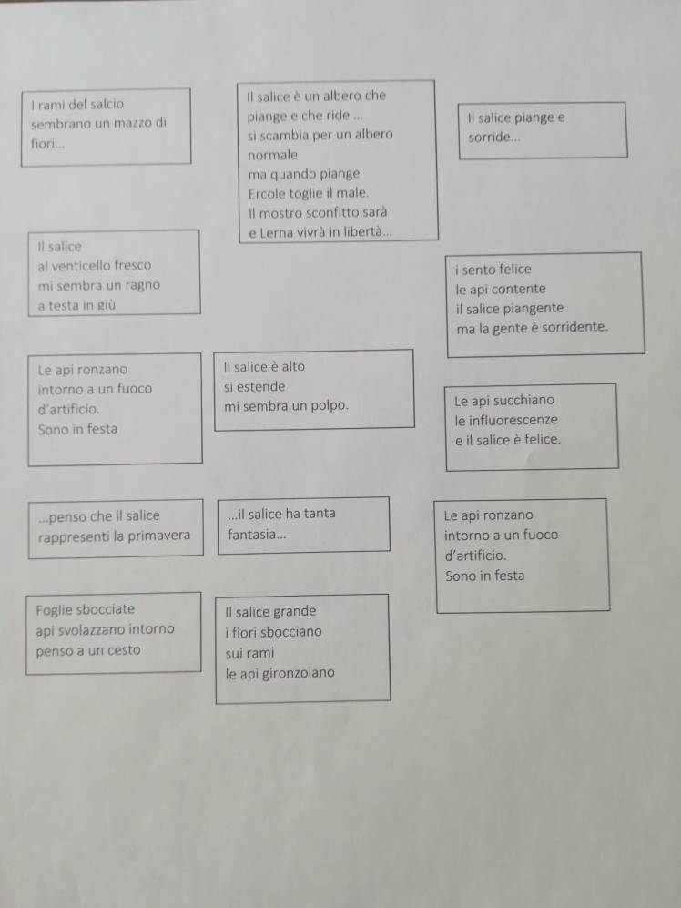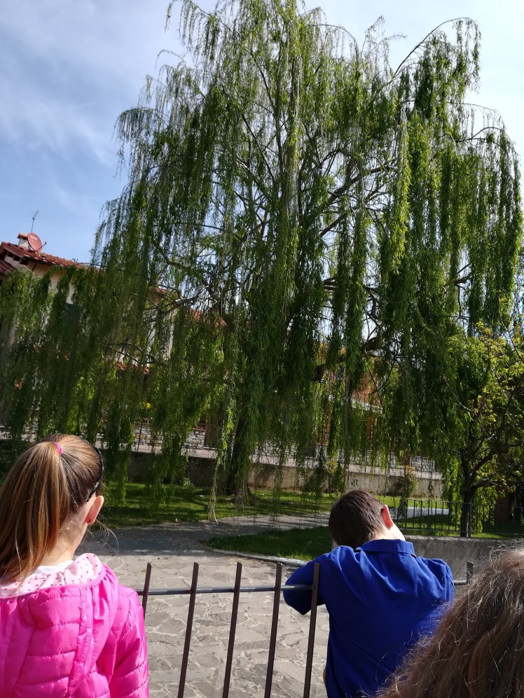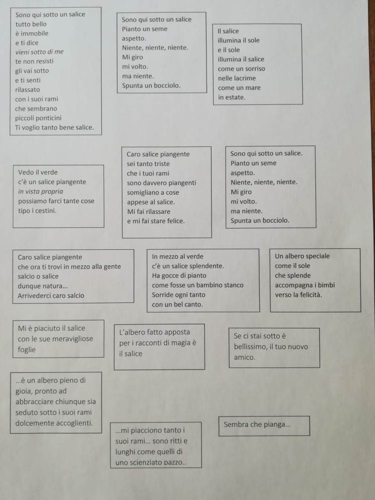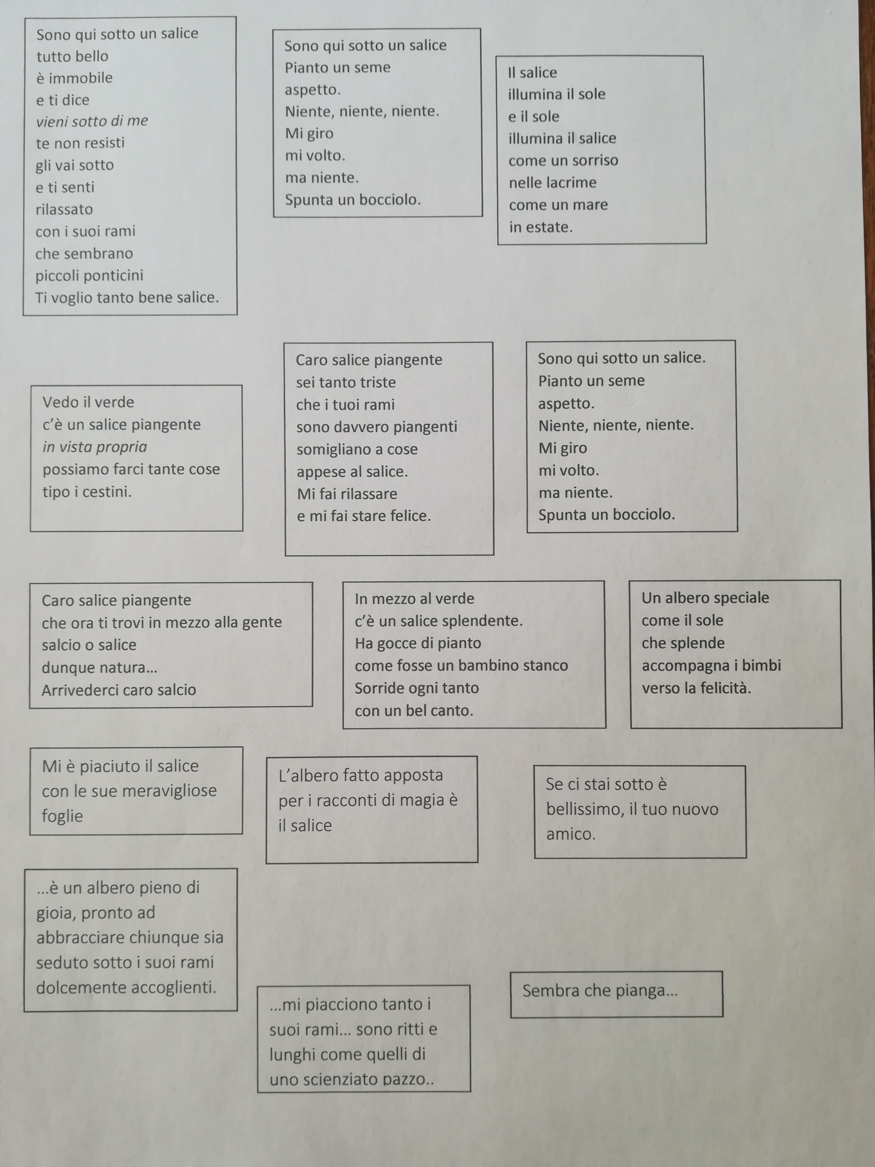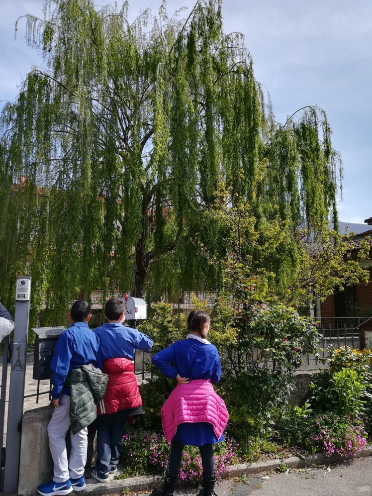 Martedì 16 aprile siamo andati a vedere un salice per riflettere e scrivere i nostri pensieri, ispirandoci a questo albero. Siamo partiti da scuola verso le 10:30; dopo la lunga camminata siamo arrivati in Via Fratelli Cervi. In un giardino abbiamo osservato un bel salice piangente. Era molto grande e maestoso con i suoi rami piene di foglie appena nate. Siamo stati in silenzio a guardarlo; poi abbiamo ripreso il cammino. Siamo arrivati in un campo dove c’è un bellissimo salcio. Ci siamo seduti davanti all’albero e in silenzio ognuno di noi ha scritto un pensiero o una poesia. Abbiamo anche fatto un disegno dal vivo: alcuni hanno disegnato il primo salice che abbiamo visto, altri il salcio. Abbiamo lavorato sotto un sole caldo, in tutta tranquillità e serenità. Il tempo è passato velocemente. Quando i maestri ci hanno detto che dovevamo ripartire ci è un po’ dispiaciuto: all’aria aperta si lavora davvero bene! Alle 12.30 siamo arrivati a scuola. eravamo stanchi, ma felici per essere stati insieme al salcio.