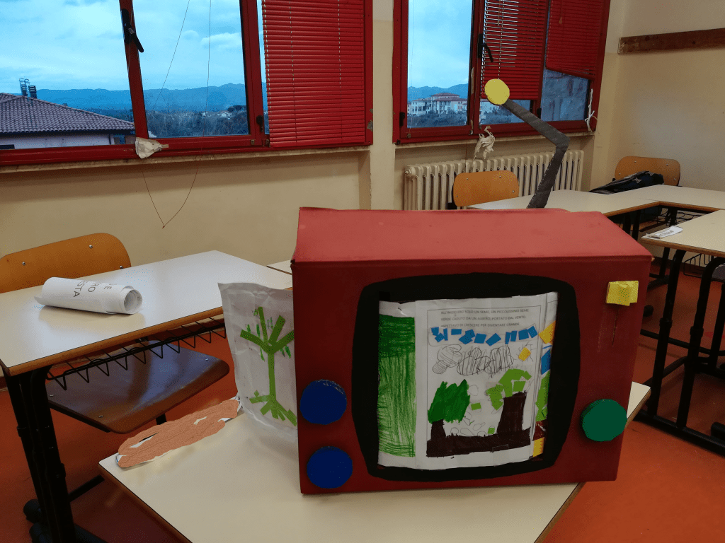 Come preannunciato abbiamo messo in gioco la nostra creatività e abbiamo ricostruito le sequenze* della storia “Un seme verde” e la abbiamo ascoltata guardando le immagini nella nostra tv di cartone. Ecco alcune immagini.