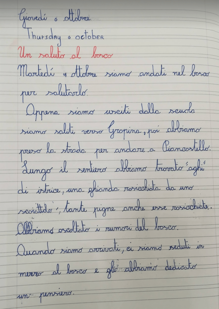 Ciao bosco oggi sono insieme alla 3A e 3B abbiamo passato dei momenti bellissimi insieme e mi hai insegnato tante cose. Grazie per le tue meraviglie, ci vedremo presto.