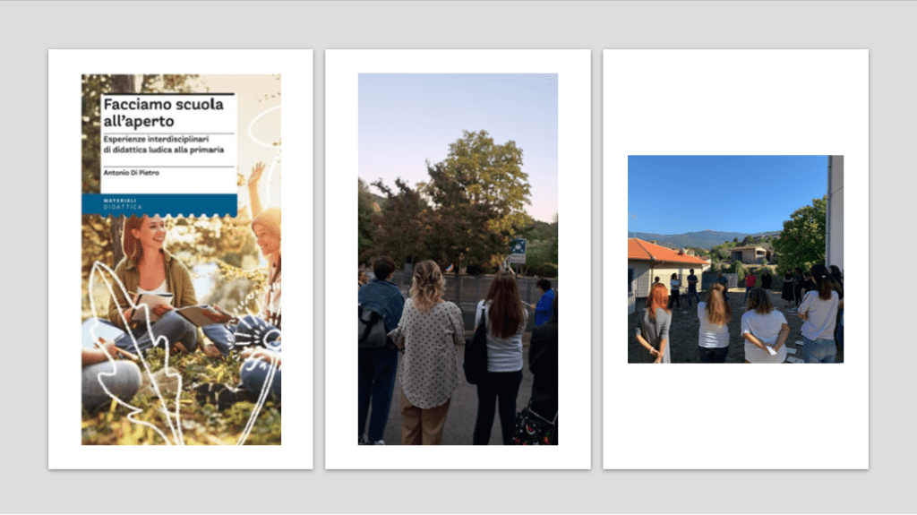 Abbiamo iniziato il nuovo anno scolastico con un corso di formazione sull’Outdoor Education con lo pedagogista ludico Antonio di Pietro. Abbiamo fatto matematica all’aperto, partendo dalla storia e da antichi giochi di strategia; esercizi creativi per imparare la grammatica e scrivere storie, in giro per le piazze del paese e nel giardino della scuola. Lo ringraziamo infinitamente per gli interessanti spunti che ci ha fornito per fare una didattica all’aperto. Di seguito alcuni momenti di lavoro…all’aperto!
