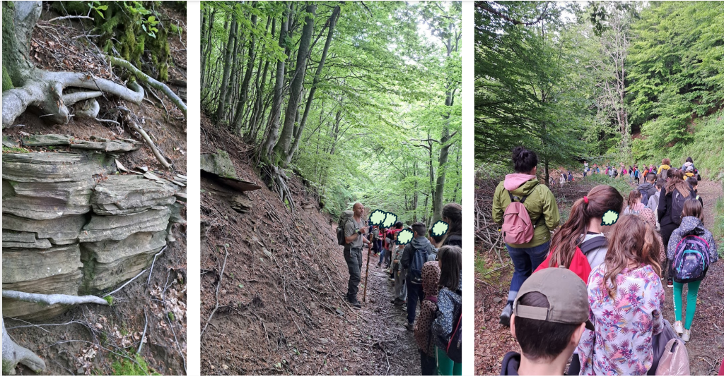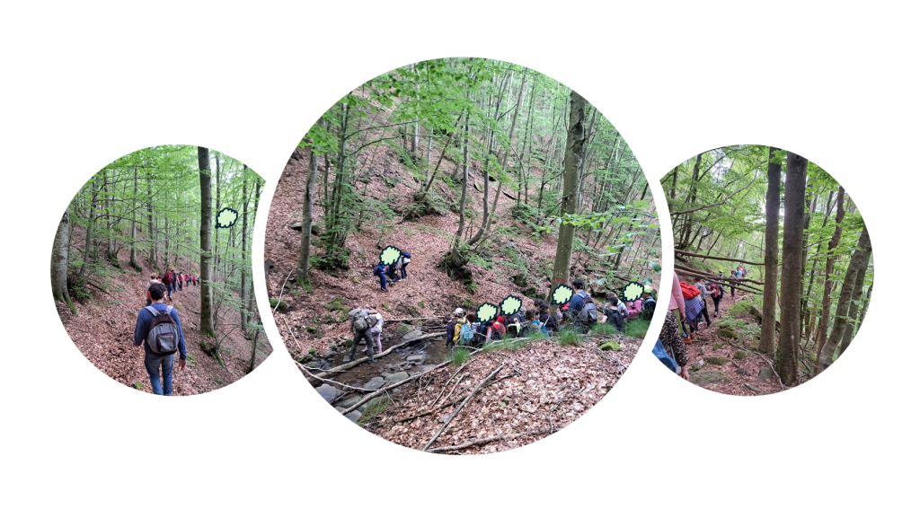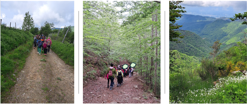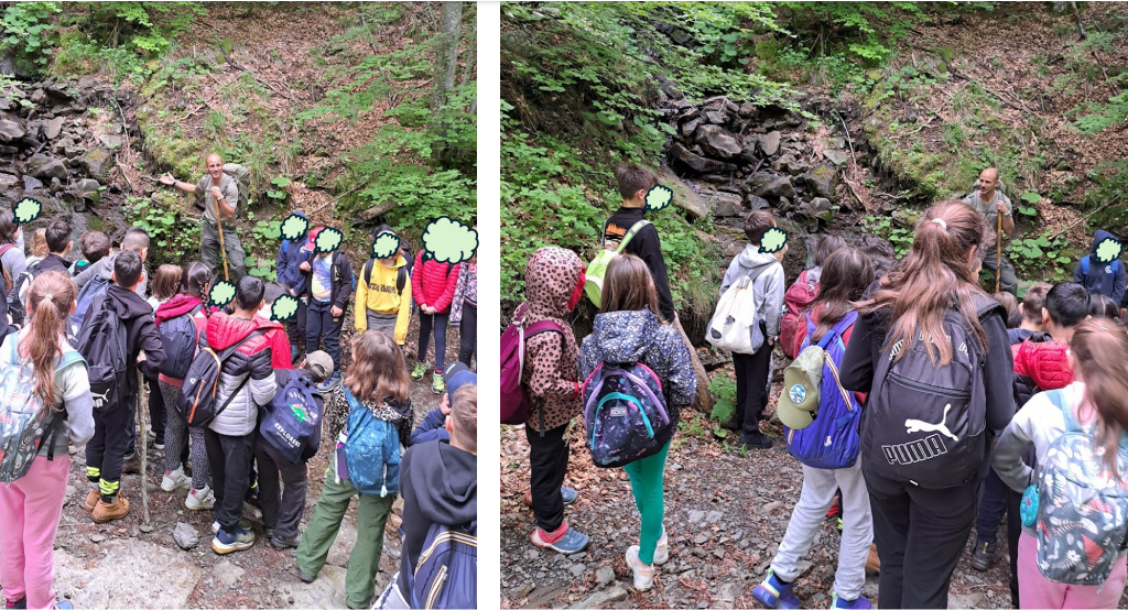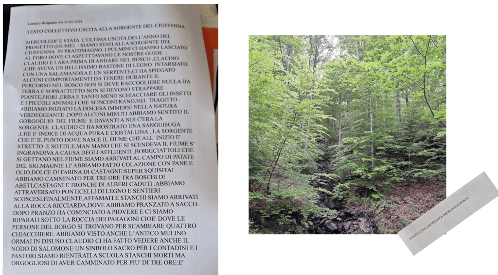 Mercoledì 29 maggio siamo andati a vedere la sorgente del torrente Ciuffenna; abbiamo fatto un percorso in mezzo al bosco: dal traforo del Pratomagno alla Rocca. Appena siamo arrivati, Claudio la nostra guida, ci ha accolto e ci ha detto delle cose importantissime: non mettere le mani in terra perché potrebbero esserci animali pericolosi, come le vipere e le zecche; camminare sempre “a monte”; seguire il sentiero, in fila e facendo attenzione al percorso lungo il quale possiamo trovare degli ostacoli: tronchi, sassi, rovi, sassi scivolosi, buche, dirupi…; nei punti scoscesi si cammina a zig zag; non si lanciano sassi o rami; non correre; non gridare; non si raccolgono i fiori e le piante. All’inizio del percorso abbiamo trovato e osservato la sorgente del Ciuffenna. L’acqua era poca, limpida. Dove esce dal terreno è purissima. Ci vivono molti animali: il gambero di fiume (animale protetto), “il bachino muratore o porta-sassi”, la sanguisuga, la trota, il ghiozzo, “ il ragno d’acqua”, la rana, la lasca, il cavedano. Lungo il cammino abbiamo osservato molti tipi di piante e fiori come i castagni, le acacie, faggi, rovi, ortica, edera, orchidee selvatiche, margherite, tarassaco, viole, le campanelle…felci, fragole selvatiche e tanti tipi di erbe e il sambuco. Il sottobosco era pieno di foglie secche, fango e terriccio. Ad un certo punto abbiamo trovato i campi delle famose patate della Rocca dove abbiamo fatto sosta; Claudio e Lara ci hanno offerto pane e olio, e una torta squisita fatta di farina di castagne. In alcuni punti del sentiero abbiamo dovuto attraversare corsi d’acqua, scavalcare tronchi, evitare rami e pozzanghere. Quando siamo arrivati in paese abbiamo pranzato. Ad un certo punto è arrivata un po’ di pioggia a farci compagnia! Più tardi abbiamo visitato il vecchio mulino ad acqua e lungo il sentiero, inciso su una roccia, abbiamo osservato il Nodo di Salomone, dei pastori. Il percorso è impegnativo, dura circa tre ore, è lungo 4,9 KM. Consigliamo di farlo per avere l’occasione di osservare la magia dei paesaggi del Ciuffenna e del Pratomagno! Ringraziamo le esperte guide ambientali Lara e Claudio.