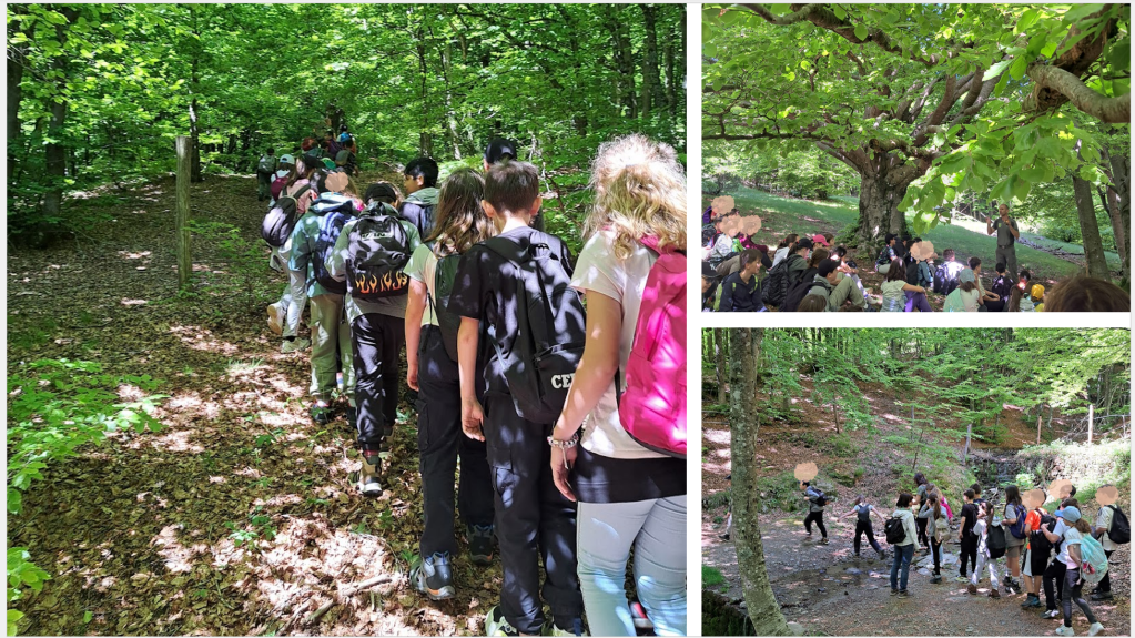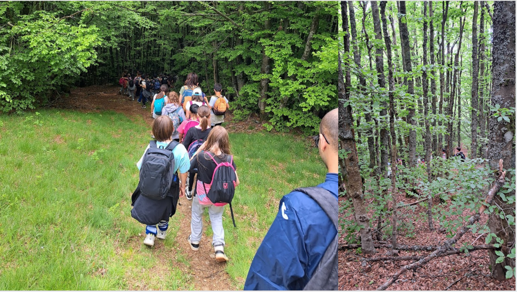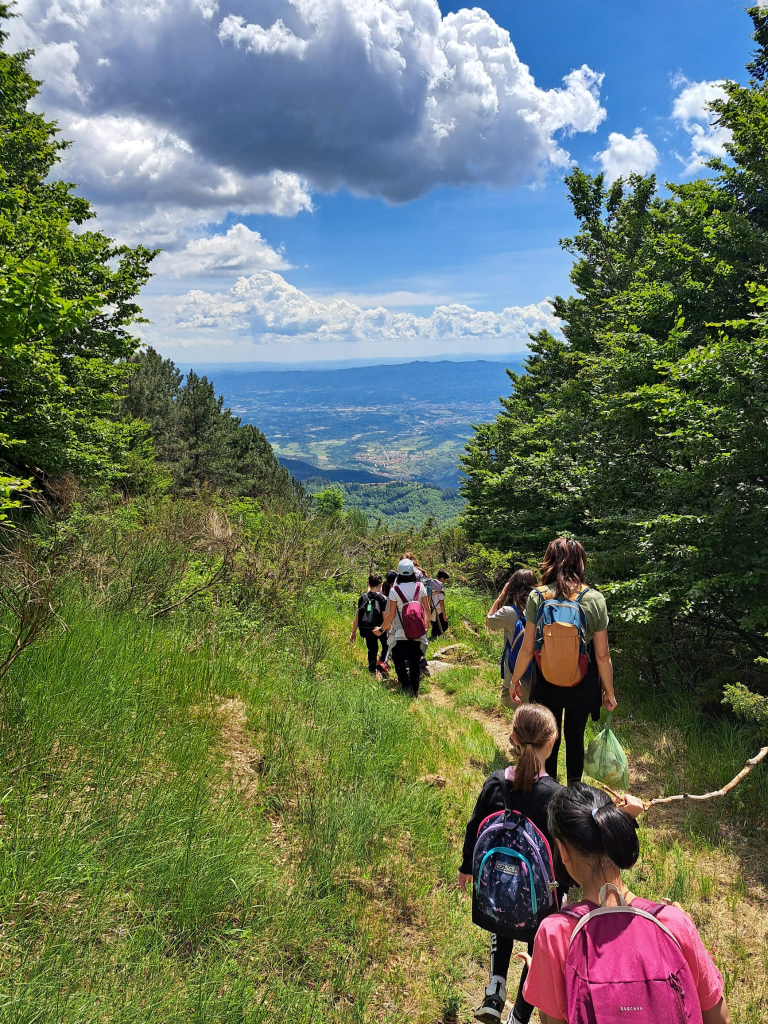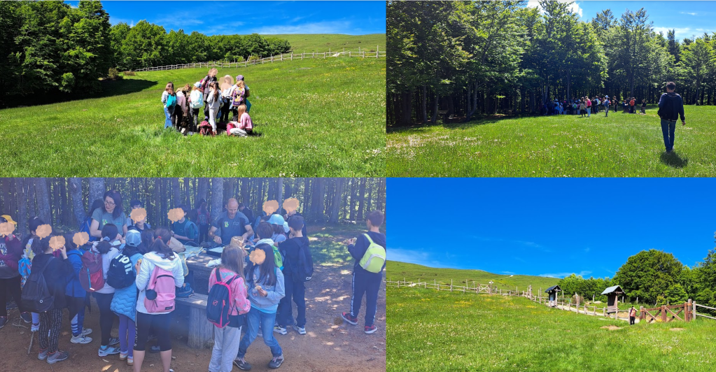 Giovedì 29 maggio siamo andati a fare un’escursione sul crinale del Pratomagno per scoprire gli alberi del posto. Ci hanno fatto da guida Lara e Claudio del Bosco Magico. Ci siamo addentrati nel bosco, una faggeta, dove abbiamo visto un faggio gigante. Claudio ci ha insegnato un metodo per calcolare l’età dell’albero, senza tagliarlo: si misura la circonferenza del tronco e si divide per 2,5. L’albero di cui si tratta ha circa 147 anni. Abbiamo continuato a salire e abbiamo raggiunto la Croce del Pratomagno. Da lassù si vedeva un bellissimo paesaggio: i paesi del Valdarno, il Lago di San Cipriano, il Lago Trasimeno, le montagne del Chianti, il Casentino. La Croce è stata progettata e costruita a partire dal 1926, quando ricorreva il settimo centenario dalla morte di San Francesco. Sul prato ci siamo divertiti a fare i “ruzzoloni”! Ci siamo incamminati verso Pozza Nera, dove abbiamo pranzato. Sotto il terreno scorre l’acqua che ogni tanto emerge. Mentre alcuni giocavano alla pozza, con i girini, altri erano nel boschetto a costruire capanne, altri ancora a correre nel prato. Prima di ripartire abbiamo osservato la pietra dove c’era un’incisione per segnalare ai pastori la via della transumanza. Siamo ripartiti lungo un percorso in discesa e siamo arrivati al Bosco Magico. Lungo tutto il percorso abbiamo incontrato altri tipi di alberi, l’abete e il castagno… e tanti fiori! Consigliamo a tutti di fare questo sentiero!
