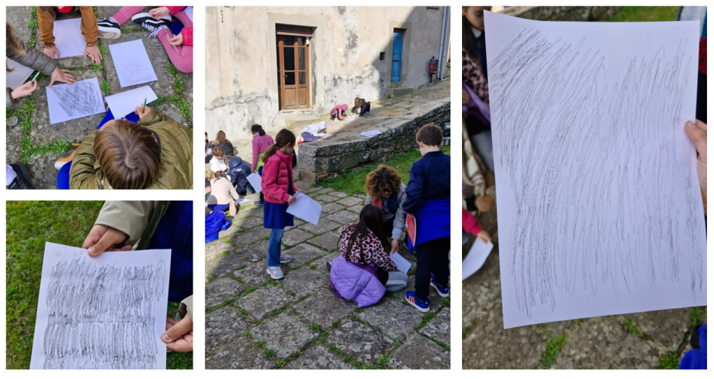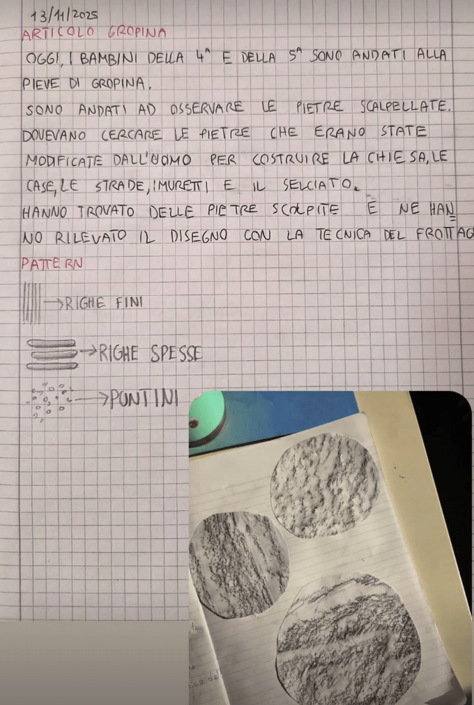 Oggi, 13\11\2025, i bambini della quarta A e della quinta A sono andati alla Pieve di Gropina. Sono andati ad osservare le pietre scalpellate. Dovevano cercare le pietre che erano state modificate dall’ uomo per costruire la chiesa, le case, le strade, i muretti e il selciato. Hanno trovato delle pietre scolpite e ne hanno rilevato il disegno con la tecnica del frottage.