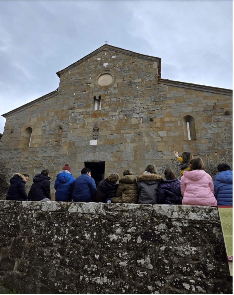Oggi, 15 gennaio 2026, siamo andati alla Pieve di Gropina per osservare la facciata e scoprire nuove parole ed alcune forme geometriche.
