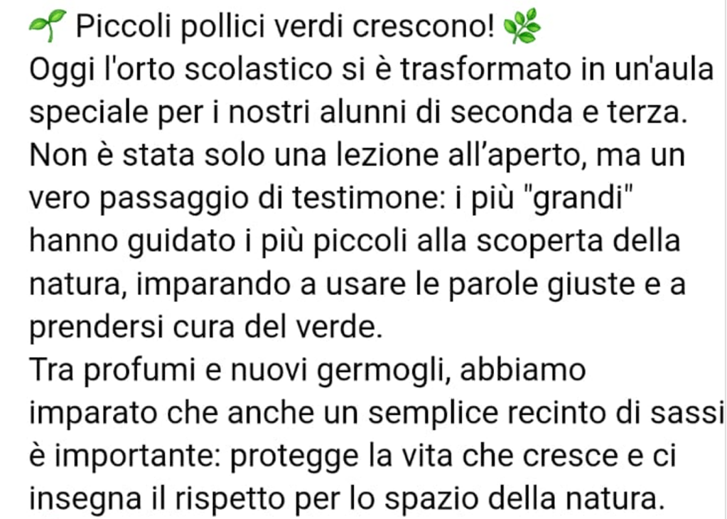 L’orto…un’aula speciale Postato il 7 marzo 2026 di icventurinoventuri Oggi l’orto della scuola si è trasformato in un’aula speciale… Condividi: Condividi su X (Si apre in una nuova finestra) X Condividi su Facebook (Si apre in una nuova finestra) Facebook Mi piace Caricamento...
