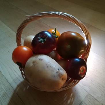 Stamani Dorotheé e Julien ci hanno portato un cestino con i pomodori e le patate che abbiamo piantato a Casale. Hanno dei bellissimi colori e un buonissimo aspetto! Anche l’orto a scuola continua a dare i suoi frutti!